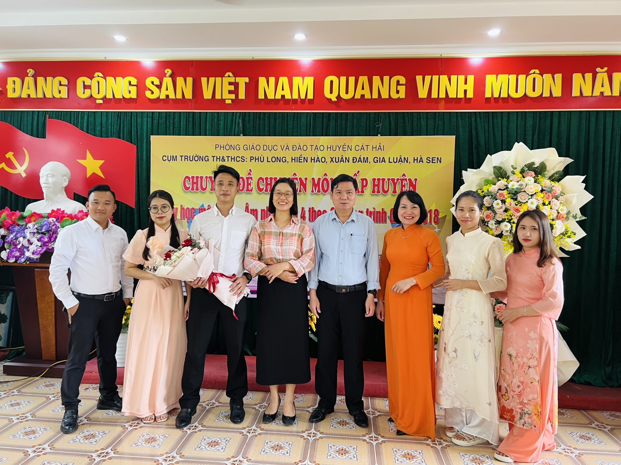 Ông Đoàn Mạnh Hùng-Trưởng phòng GD&ĐT huyện Cát Hải tặng hoa chúc mừng cho thầy, cô giáo