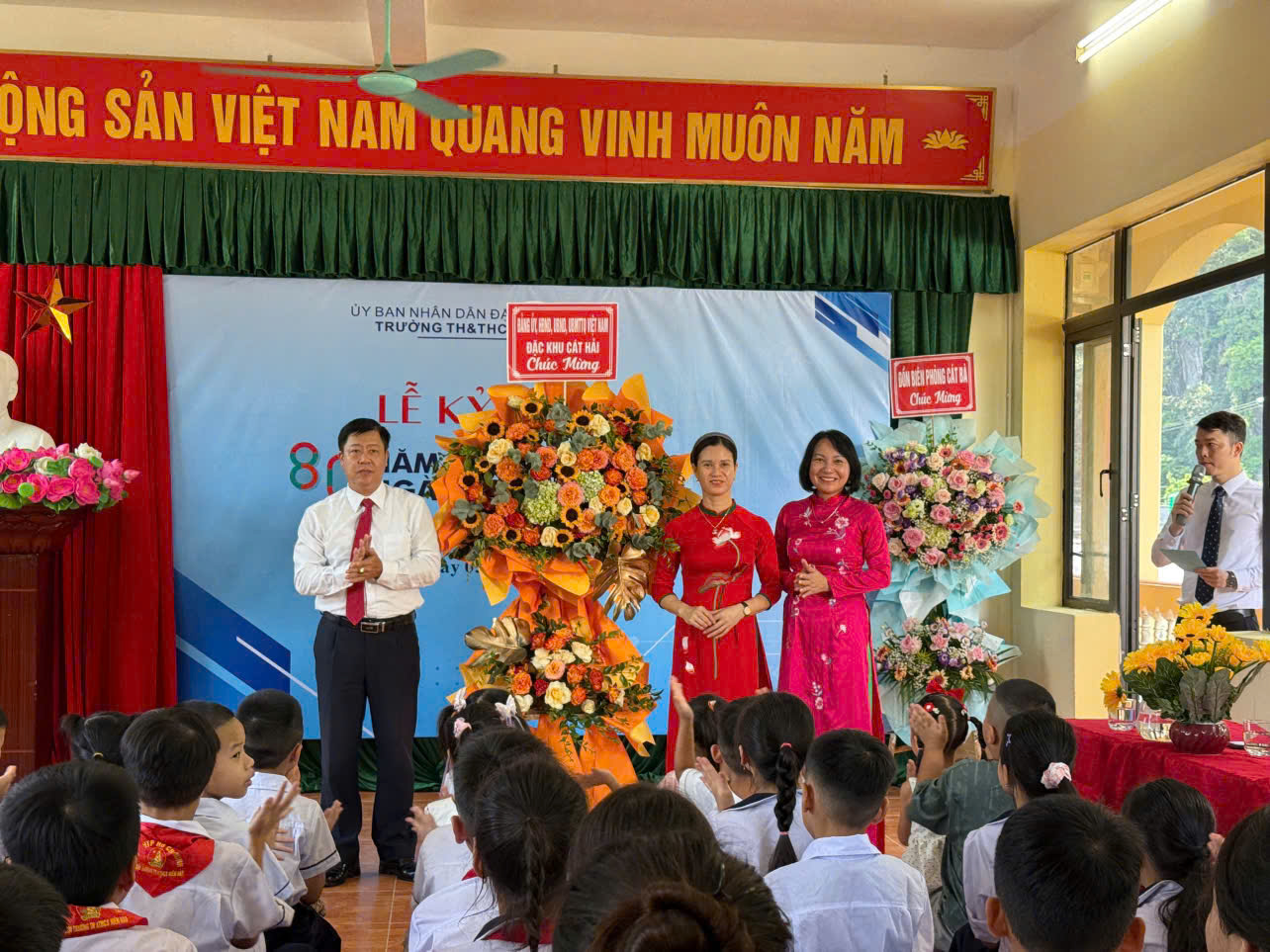 Nhân dịp này, Uỷ ban nhân dân đặc khu Cát Hải đã trao 2 phần quà (mỗi suất trị giá 1.000.000 đồng)cho các em học sinh có hoàn cảnh khó khăn của nhà trường.